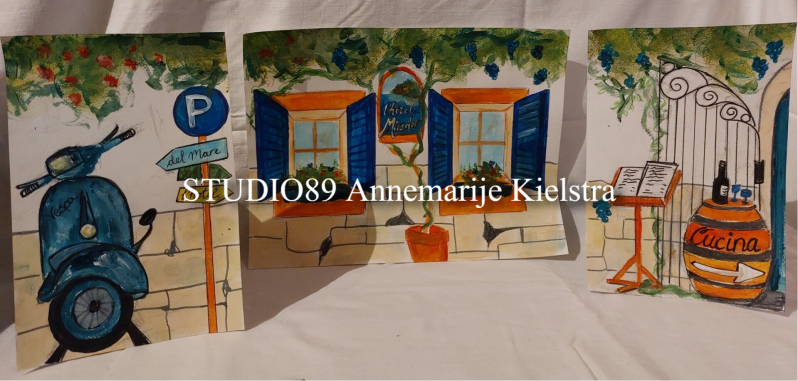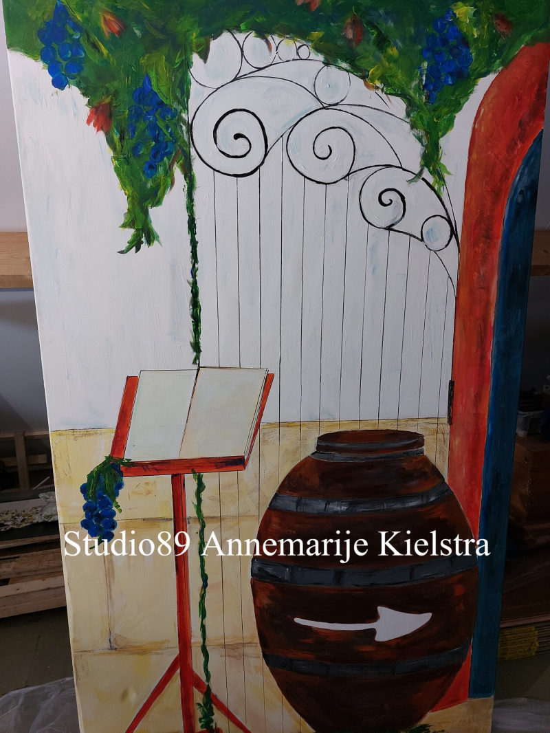 Schilderingen op zelfgemaakte doeken: 3x een frame van 120x200 en 2x een frame van 150x200.